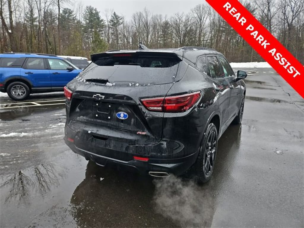 Features: Preferred Equipment Group 1RS (Heated Steering Wheel), Blazer RS, Car Bravo Certified, 4D Sport Utility, 3.6L V6 SIDI, 9-Speed Automatic with Overdrive, AWD, Black, Jet Black/Nightshift Blue Leather, 3.49 Final Drive Axle Ratio, 4-Wheel Disc Brakes, 8 Speakers, 8-Way Power Driver Seat Adjuster, ABS brakes, Air Conditioning, Alloy wheels, AM/FM radio: SiriusXM with 360L, Apple CarPlay/Android Auto, Auto High-beam Headlights, Auto-dimming door mirrors, Auto-dimming Rear-View mirror, Automatic temperature control, Bose Premium 8-Speaker Audio System Feature, Brake assist, Bumpers: body-color, Child-Seat-Sensing Airbag, Compass, data system, Delay-off headlights, Driver door bin, Driver vanity mirror, Dual front impact airbags, Dual front side impact airbags, Electronic Stability Control, Emergency communication system: OnStar and Chevrolet connected services capable, Four wheel independent suspension, Front anti-roll bar, Front Bucket Seats, Front Center Armrest, Front dual zone A/C, Front reading lights, Fully Automatic Headlights, Garage door transmitter, Heated door mirrors, Heated Front Seats, Heated Front seats, Heated steering wheel, Illuminated entry, Knee airbag, Leather Shift Knob, Leather steering wheel, Low tire pressure warning, Navigation System, Occupant sensing airbag, Outside temperature display, Overhead airbag, Overhead console, Panic alarm, Passenger door bin, Passenger vanity mirror, Perforated Leather-Appointed Seat Trim, Power door mirrors, Power Driver Lumbar Control, Power driver seat, Power Liftgate, Power Passenger Seat, Power passenger seat, Power steering, Power Windows, Premium audio system: Chevrolet Infotainment 3 Premium, Radio: Chevrolet Infotainment 3 Premium System, Rear anti-roll bar, Rear reading lights, Rear seat center armrest, Rear window defroster, Rear window wiper, Remote Keyless Entry, Ride & Handling Suspension, Security system, SiriusXM w/360L, Speed control, Speed-sensing steering, Split folding rear seat, Spoiler, Steering wheel mounted audio controls, Tachometer, Telescoping steering wheel, Tilt steering wheel, Traction control, Trip computer, Turn signal indicator mirrors, Variably intermittent wipers, Voltmeter, Wheels: 20 Gloss Black Aluminum, and Wheels: 20 Technical Gray Aluminum.