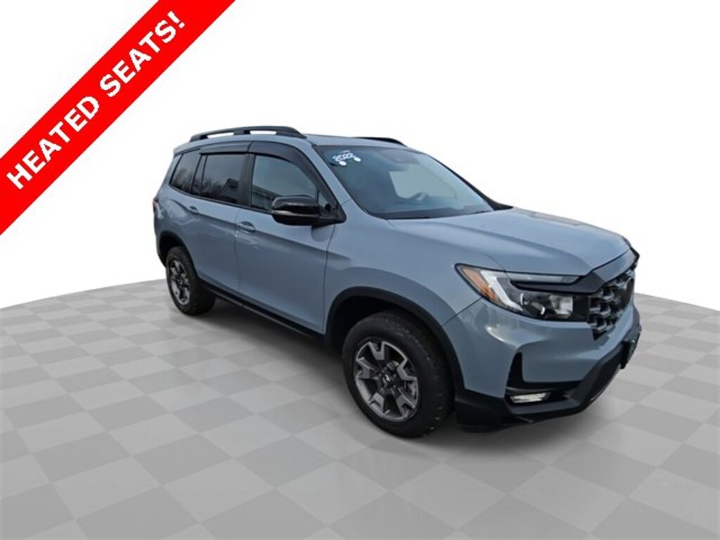 Features: Passport TrailSport, Car Bravo Certified, 4D Sport Utility, 3.5L V6 24V SOHC i-VTEC, 9-Speed Automatic, AWD, Sonic Gray Pearl, Black Leather, 4-Wheel Disc Brakes, 4.334 Axle Ratio, 7 Speakers, A/V remote: CabinControl, ABS brakes, Air Conditioning, Alloy wheels, Apple CarPlay/Android Auto, Auto High-beam Headlights, Auto-dimming Rear-View mirror, Automatic temperature control, Backup Camera, Blind Spot Information (BSI) System warning, Brake assist, Bumpers: body-color, Compass, data system, Delay-off headlights, Driver door bin, Driver vanity mirror, Driver's Seat Mounted Armrest, Dual front impact airbags, Dual front side impact airbags, Electronic Stability Control, Emergency communication system: HondaLink Assist, Forward collision: Collision Mitigation Braking System (CMBS) + FCW mitigation, Four wheel independent suspension, Front anti-roll bar, Front Bucket Seats, Front Center Armrest, Front dual zone A/C, Front Fog Lights, Front reading lights, Fully Automatic Headlights, Garage door transmitter: HomeLink, Heated door mirrors, Heated Front Bucket Seats, Heated Front seats, Illuminated entry, Lane departure: Lane Keeping Assist System (LKAS) active, Leather-Trimmed Seats w/Orange Stitching, Low tire pressure warning, Memory seat, Navigation system: Honda Satellite-Linked Navigation System, Occupant sensing airbag, Outside temperature display, Overhead airbag, Overhead console, Panic alarm, Passenger door bin, Passenger seat mounted armrest, Passenger vanity mirror, Power door mirrors, Power driver seat, Power Liftgate, Power Moonroof, Power passenger seat, Power steering, Power Windows, Radio: 215-Watt Audio System w/7 Speakers, Rear air conditioning, Rear anti-roll bar, Rear reading lights, Rear seat center armrest, Rear window defroster, Rear window wiper, Remote Keyless Entry, Roof rack: rails only, Security system, SiriusXM Satellite Radio, Speed control, Speed-sensing steering, Split folding rear seat, Spoiler, Steering wheel mounted audio controls, Tachometer, Telescoping steering wheel, Tilt steering wheel, Traction control, Trip computer, Turn signal indicator mirrors, Variably intermittent wipers, and Wheels: 18 Machine-Finish Alloy.