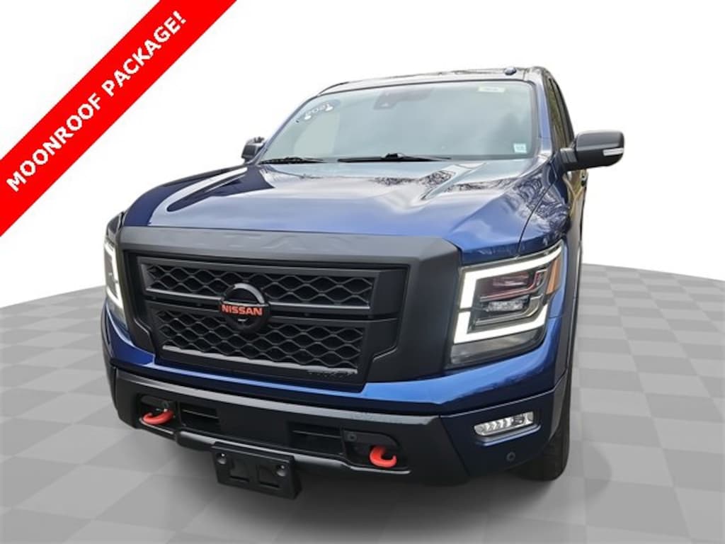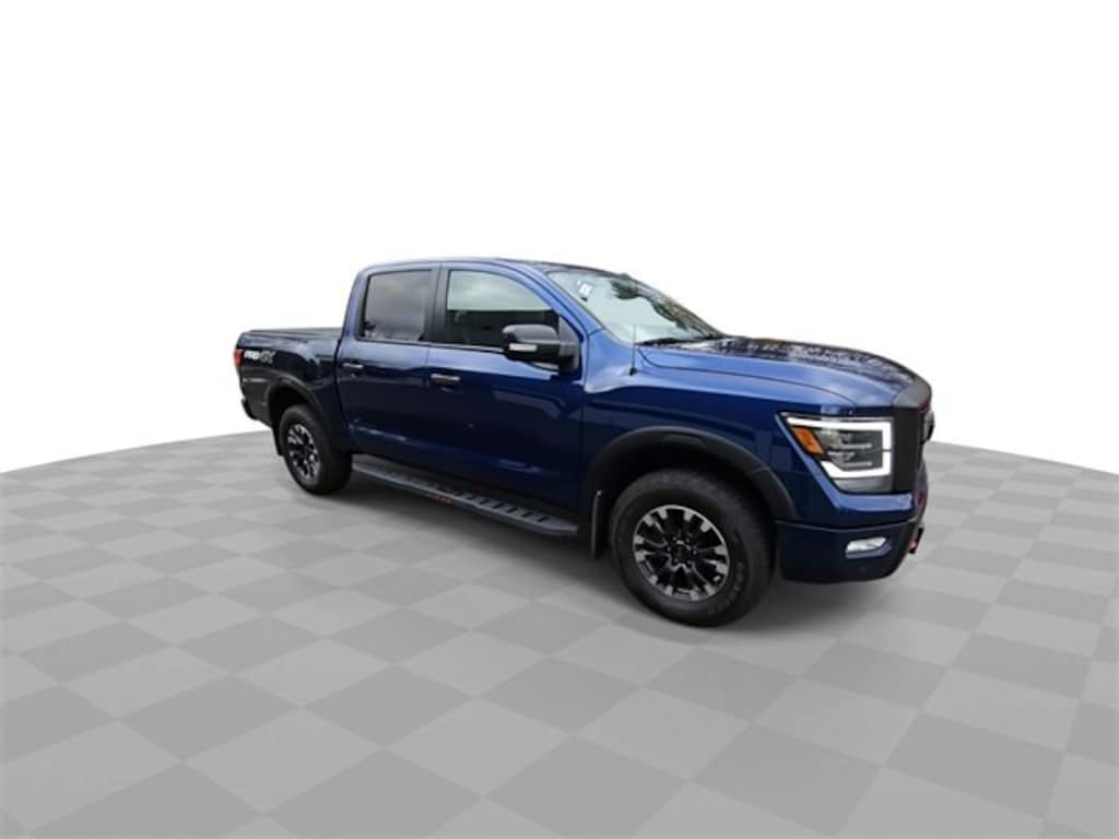 Features: Titan PRO-4X, Car Bravo Certified, 4D Crew Cab, 5.6L V8 DOHC 32V 400hp, 9-Speed Automatic, 4WD, Deep Blue Pearl Metallic, Black Leather, 3.692 Axle Ratio, 4-Wheel Disc Brakes, 6 Speakers, ABS brakes, Air Conditioning, Alloy wheels, Auto High-beam Headlights, Auto-dimming Rear-View mirror, Auto-leveling suspension, Automatic temperature control, Blind Spot Warning, Brake assist, Cloth Seat Trim w/Vinyl Bolsters, Compass, data system, Delay-off headlights, Driver door bin, Driver vanity mirror, Dual front impact airbags, Dual front side impact airbags, Electronic Stability Control, Emergency communication system: NissanConnect Services, Front anti-roll bar, Front Bucket Seats, Front Captain's Seats, Front Center Armrest, Front dual zone A/C, Front Fog Lights, Front reading lights, Front wheel independent suspension, Fully Automatic Headlights, Garage door transmitter: HomeLink, Heated door mirrors, Illuminated entry, Knee airbag, Leather steering wheel, Low tire pressure warning, Navigation system: NissanConnect Navigation, NissanConnect featuring Apple CarPlay and Android Auto, Occupant sensing airbag, Outside temperature display, Overhead airbag, Overhead console, Panic alarm, Passenger door bin, Passenger vanity mirror, Power door mirrors, Power driver seat, Power steering, Power Windows, Radio: NissanConnect w/Navigation, Rain sensing wipers, Rear anti-roll bar, Rear Parking Sensors, Rear seat center armrest, Rear step bumper, Rear window defroster, Remote Keyless Entry, Security system, SiriusXM Satellite Radio, Speed control, Speed-sensing steering, Speed-Sensitive Wipers, Split folding rear seat, Steering wheel mounted audio controls, Tachometer, Telescoping steering wheel, Tilt steering wheel, Traction control, Trip computer, Variably intermittent wipers, Voltmeter, and Wheels: 18 x 8 Painted Dark Finish Alloy.